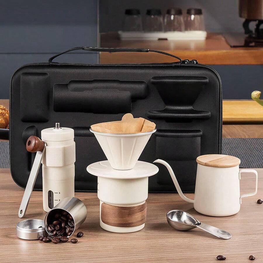piece portable coffee set including a manual grinder, brewing tools, and a travel case. Perfect for trips, office use, and making fresh coffee anywhere.
